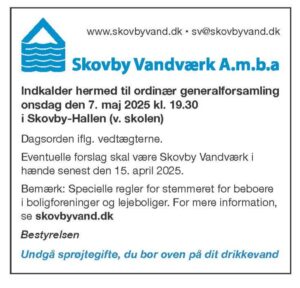 Skovby Vandværk indkalder til ordinær generalforsamling onsdag d. 7. maj kl. 19.30 i Skovby Hallen. Se mere her: Generalforsamling – Skovby Vandværk Amba